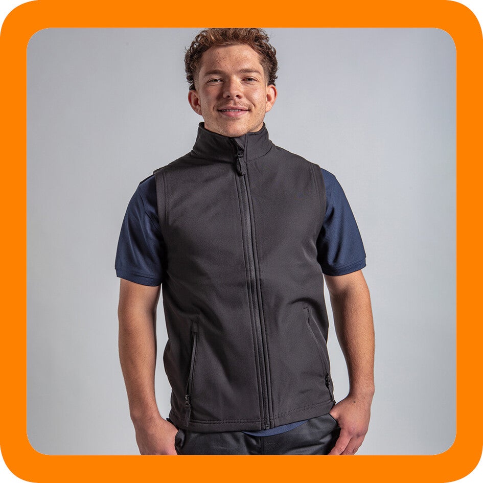 An extra layer for keeping warm outdoors, the softshell gilet features full-front zip fastening and handy front zipped hand pockets. The shell of the gilet will keep you warm and dry due to the windproof and showerproof properties.