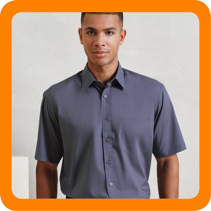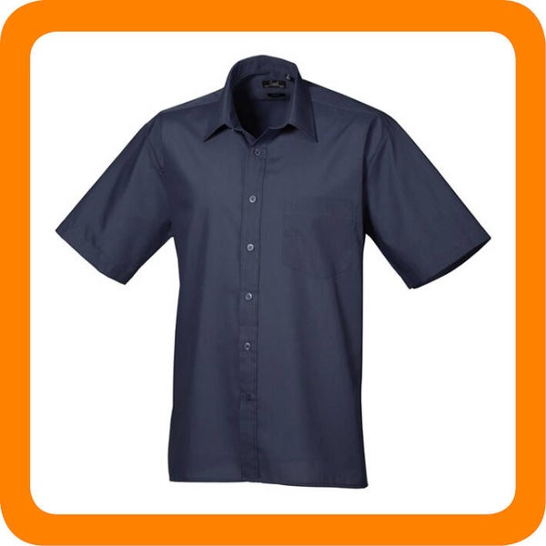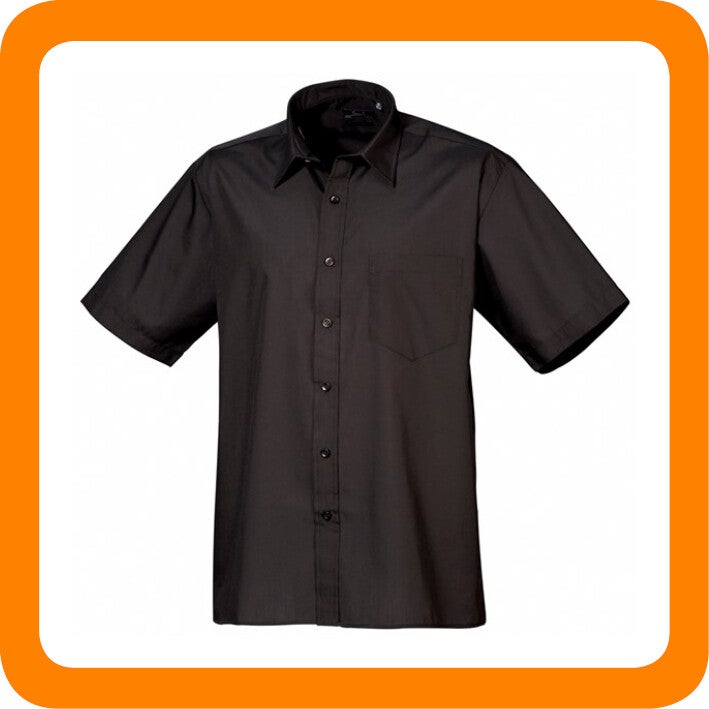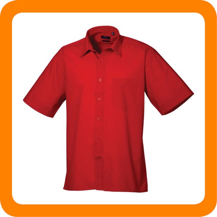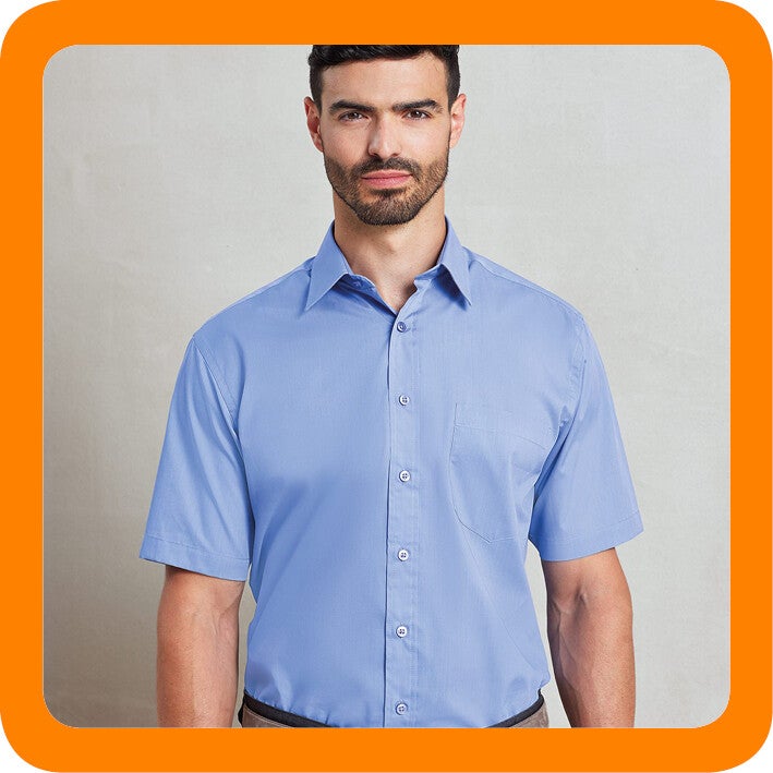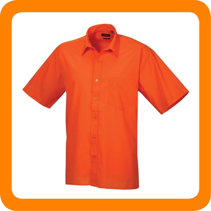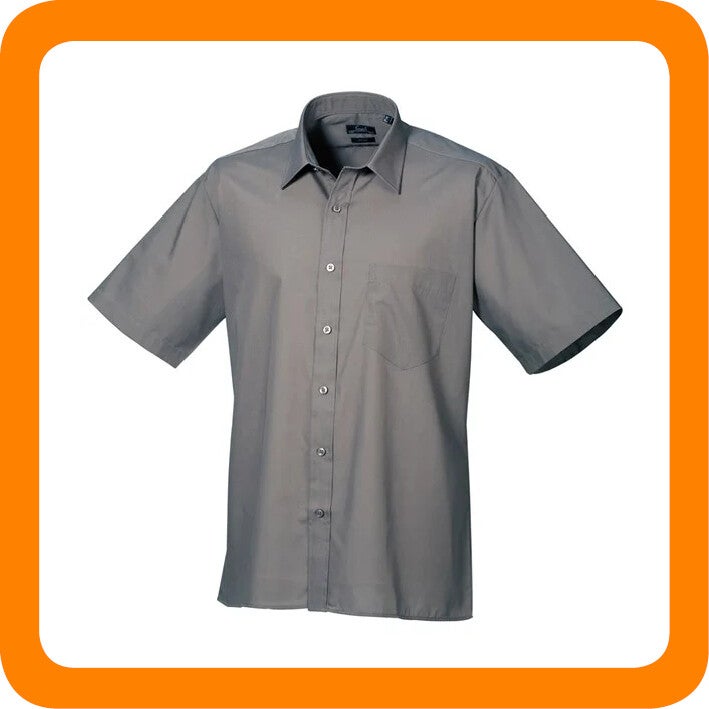 Een Poplin-werkoverhemd met korte mouwen voor heren, verkrijgbaar in 9 kleuren uit de 'Colours Collection' van Premier. Dit overhemd met klassieke pasvorm heeft een stijve, formele kraag waarin een stropdas past en het lijf heeft een handig borstzakje aan de linkerkant.